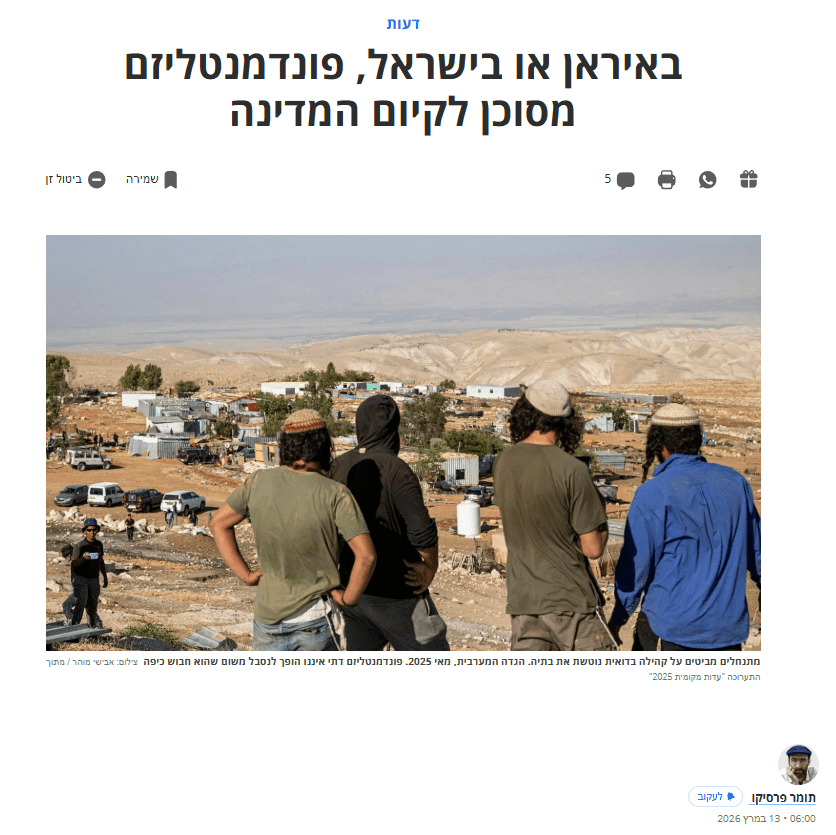 אסור, אפוא, שאיראן תשיג נשק גרעיני. בזה נתניהו צודק. הסיבה איננה רק עוינותה של איראן לישראל, אלא אופיו של המשטר. פונדמנטליזם דתי מתקיים בסיפור קוסמי בו ההיסטוריה היא זירה למימוש רצון האל. כאשר תפיסה כזו מקבלת לרשותה מנגנונים של מדינה מודרנית התוצאה היא אסון. אותה אמת תקפה גם פנימה. פונדמנטליזם דתי איננו הופך לנסבל משום שהוא חבוש כיפה ואיננו מאבד מכוח ההרס שלו משום שהוא מדבר עברית. פונדמנטליזם שמחזיק בכוח פוליטי, באיראן או בישראל, מסוכן לקיומה של המדינה.