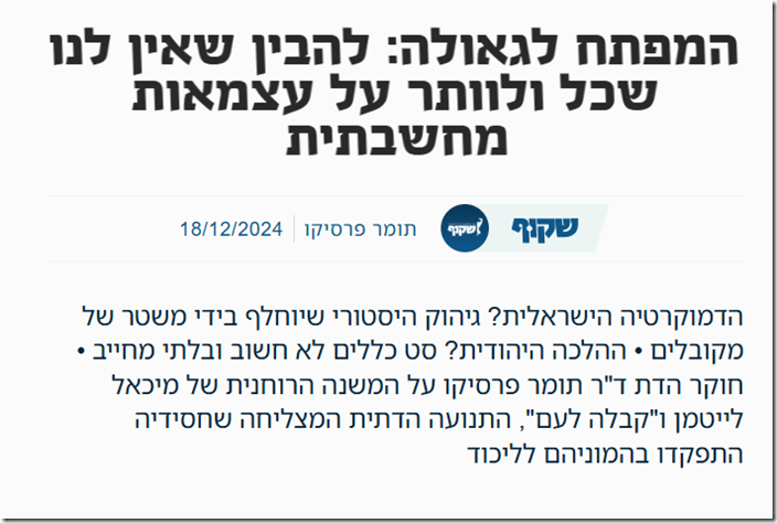 אנשים שאוחזים בחזון משיחי, שדוחים את ערכי תנועת הנאורות ותופשים קידמה לא כברכה אלא כאיום, ישמחו כאשר החברה שהם משתייכים אליה תיהפך לענייה יותר, משכילה פחות, וחילונים יעזבו אותה. הם ימשיכו להזרים תקציבים חסרי פרופורציה לחברה החרדית גם בזמן מלחמה, לא רק כדי לתחזק חברה של לומדי תורה, אלא מפני שקריסה כלכלית איננה סכנה, אלא שאיפה. אותם אנשים גם יפרקו את המשטרה לא רק כדי לשסות אותה באופוזיציה פוליטית, אלא משום שהעדר שלטון חוק ואי־סדר כלליים משרתים אותם ואת חזונם.