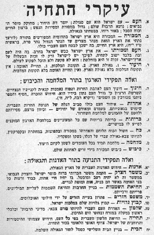 אותה משמעות פוליטית קיבלה ביטוי מפורש במקבץ "עיקרי התחיה" שכתב אברהם 'יאיר' שטרן כחוקה לארגון הלח"י שתחת הנהגתו. ב-1941 פורסם המסמך המלא, שאינו אלא רשימה ובה י"ח נקודות שעל פי שטרן חיוניות למען תקומת האומה: מאחדות, דרך יעוד ועד כיבוש. הסעיף הי"ח והאחרון מקדם את "בניין הבית השלישי כסמל לתור הגאולה השלמה". המקדש מהווה כאן סיום ומיצוי לתהליך בניית האומה על אדמתה, בניגוד חריף לדרכם של הרצל ובן גוריון כאמור. על סעיף אחרון זה התנהל פולמוס אף בתוככי הלח"י, שכן גם במחתרת לא כולם חשבו שהגיע הזמן לחזור לפולחן פרים וכבשים. אליהו לנקין, לימים מפקד האלטלנה וחבר כנסת מטעם 'חרות', התנגד לכל ביטוי דתי במנשר. שטרן הסביר לו ש"עלינו להיות לכת סגולה בתוך עם סגולה, כת נושאי רעיון קדוש." לנקין לא השתכנע. לימים יירש יצחק שמיר את שטרן, וידחק החוצה גם הוא את המוטיבים המשיחים הללו.