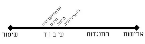 כדי למפות את ההתיחסויות השונות של הניו-אייג'יסטים היהודיים להלכה מסרטטים עמיתי המלומדים את התרשים הבא: