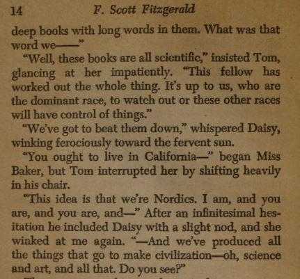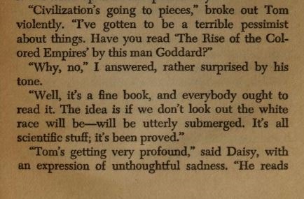 "יצא לך לקרוא את 'עלייתן של האימפריות הצבעוניות'?" שואל בספר 'גטסבי הגדול' יריבו של גטסבי, טום ביוקנן. ביוקנן מסביר כי "הרעיון הוא שאם לא ניזהר, הגזע הלבן פשוט ישקע לחלוטין. זה הכל מאוד מדעי… זו אחריותנו, בתור הגזע השליט, להישמר, או שהגזעים האחרים האלה ישתלטו על העניינים" (מאנגלית: ליאור שטרנברג, אחוזת בית, 2013)