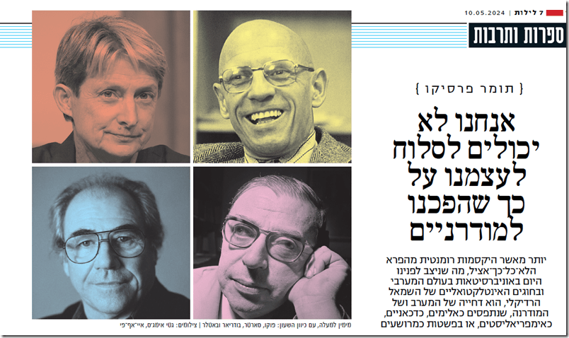 כרגע המרד הזה במודרנה מתמקד בישראל. כנוכחות המובהקת ביותר של "המערב" בלב "המזרח", כמה שנתפס כשריד הנבזי האחרון לשלטון קולוניאליסטי ולאימפריאליזם, ישראל משמשת ככליא ברק לקצפם של האוקסידנטליסטים. מובן שהרבה מהביקורת על ישראל מוצדקת: ישראל שולטת צבאית על מיליונים ולמרבה הזוועה אינה מאותתת שהיא מבקשת לשים לכך סוף. אולם הסגסוגת שמשלבת פוסט-קולוניאליזם, פוסט-לאומיות ותיאוריות אנטי-גזעניות, שמתממשת כצהלות שמחה על ה"התנגדות" של החמאס, מסמנת משהו עמוק יותר מאשר התנגדות מוצדקת לכיבוש.
