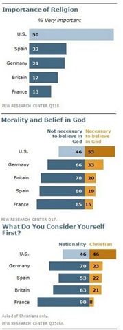 (2) כאמור, ארה"ב היא מדינה שהדת ממלאת בה תפקיד חשוב. עד כמה? סקר חדש של מכון Pew משווה אותה עם כמה מדינות אירופאיות ומעלה את הממצאים הבאים – ראו משמאל.