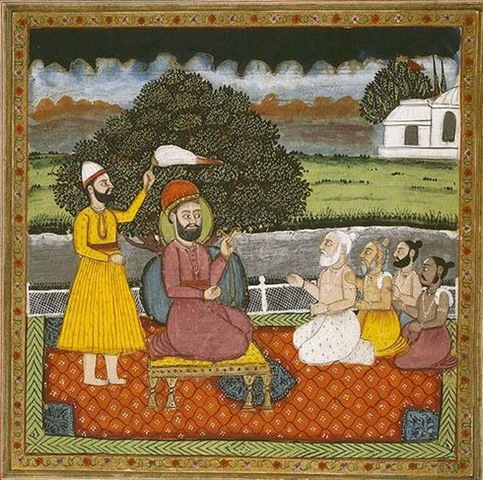 גורו נאנק, מייסק הדת הסיקית, נפגש עם אנשי דת הינדים, לצורך המרה. ציור מתחילת המאה ה-19