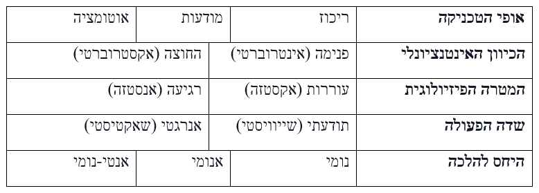 שנית, יש לבחון את הכיוון האינטנציונלי של המדיטציה, דהיינו האם הטכניקה הספציפית מכוונת את המתרגל להתכנסות פנימה במסגרתה יחקור את פנים נפשו וינסה לגלות בה את אותו מימד של גאולה, או שמא ליציאה ממנו והלאה, בה המתרגל יבקש את ישועתו ממציאות החיצונית לו. ניתן לכנות טיפוסים מדיטטיבים אלה אינטרוברטי ואקסטרוברטי (מונחים שנעשה בהם שימוש כבר אצל רודולף אוטו, קארל יונג ווולטר טרנס סטייס, ובמחוזותנו אצל חביבה פדיה). האינטרוברטי יפנה אל פנימיותו ויבקש למצוא את האמת העמוקה בתוכו, והאקסטרוברטי יחפש גאולה מתוך יציאה מעצמו וקשר עם הנמצא מחוצה לו.