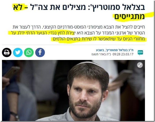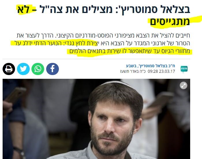 שר האוצר סמוטריץ' בעצמו תמך בסירוב להתגייס על רקע שילוב נשים(!) בצה"ל. רבנים בציבור הציוני דתית קראו לא להתגייס, או לדחות גיוס, ליחידות מסויימות, על רקע שילוב נשים, או שירת נשים, או שיעורי ספורט עם מדריכות במקום מדריכים, או בעיות הלכתיות אחרות לטעמם. האם סירוב להתגייס לצה"ל מפני שהוא משלב נשים ביחידות הוא לגיטימי, וסירוב לשרת במילואים על רקע מהפכה משפטית שמרבית המומחים בעולם סבורים שמחרבת את הפרדת הרשויות במדינה – לא?