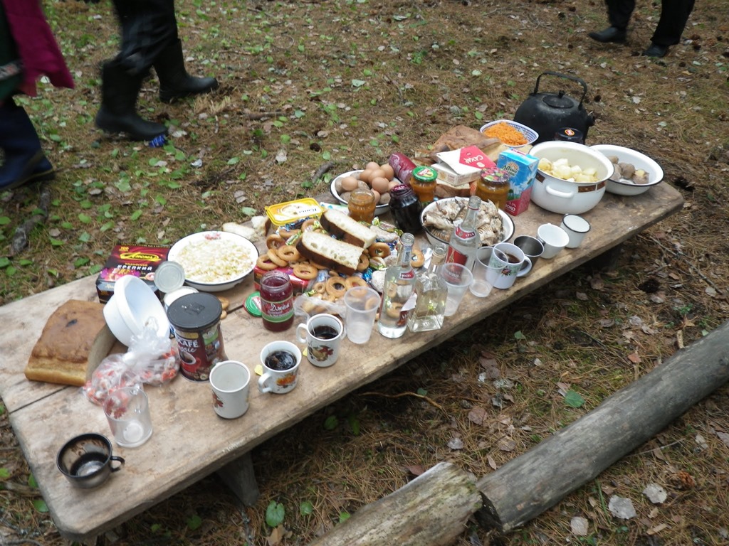 שולחן הסעודה של ארוחת הקרבן בטקס לאלת הנהר. על פי המנהג בשבט יש חובה לאכול ולשתות את כל ארוחת המנחה - כולל כל בקבוקי הוודקה