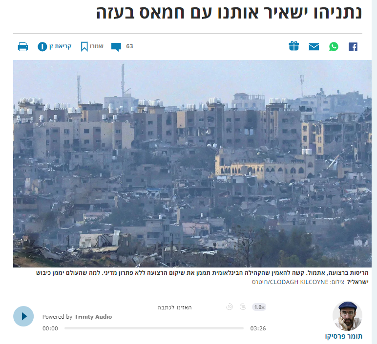 באופן אירוני, אם נתניהו יצליח בקרוב לכונן דיקטטורה זה יקל על החשבון העתידי. זה לא אנחנו, נאמר, הרי היינו תחת שלטון רודני, הרי מפגינים נעצרו, הופשטו, הוכו. הרי שומרי הסף נרמסו, הרי האופוזיציה דוכאה. נצטרך בעתיד גם שעיר לעזאזל, ולמזלנו יש כבר מי שעושה הכל כדי למלא את התפקיד. זה לא אנחנו, נאמר, זה החרד"ל והכהניסטים, הם אלה שלא איפשרו לנתניהו לסיים המלחמה, הם אלה שדרשו הרעבה. בעתיד יתברר שכולם היו נגד הפסקת הסיוע ההומניטרי לבד מסמוטריץ' ובן גביר.