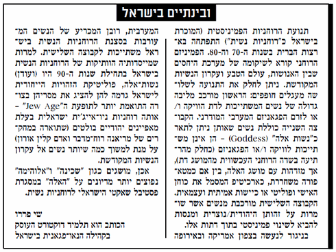 לכן, כשפעילות רוחנית פמיניסטית עוסקת בהעצמת נשים, ביצירת שפה חלופית, בדיבור על אלהים בנקבה, ביצירת טקסים שנשים הן המנהיגות הרוחניות בהן, בקידוש-מחדש של סמלים נקביים וחידוש פולחנים נשיים (מפולחנים שמזמנים את האלה למעגל ועד טקס תפילת ראש חודש בכותל), בניסוח מדרשים למדניים חתרניים ופירסומם, בהפצת מיתוסים וסיפורים על הנשיות המקודשת (שבחלקם הופכים לרבי מכר בעשרות שפות, כגון "המיוחלת") – אני לא רואה איך אפשר לטעון שהן לא פעילות פוליטית.