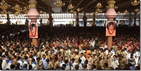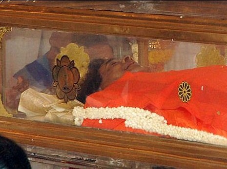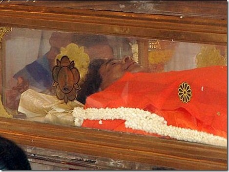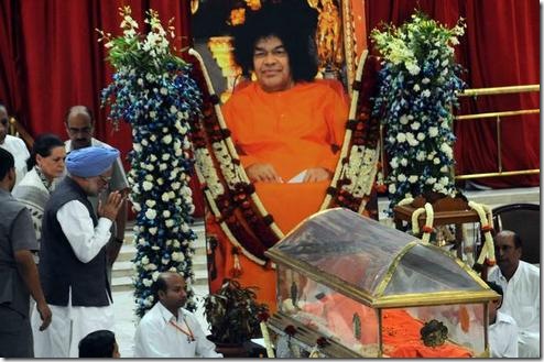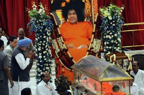 ההודי עם הטורבן שעושה "נמסטה" עם הידיים מול ארון הזכוכית הוא ראש ממשלת הודו מנמוהן סינג'. לשמאלו עומדת סוניה גנדהי, נצר למשפחת נהרו ואינדירה, ראשי הממשלה לשעבר, ונשיאת מפלגת הקונגרס ההודית, השלטת בהודו בעת הזאת (וכמעט תמיד). הגופה בארון הזכוכית שייכת לסאתיה סאי באבא, אחד מהקדושים הפופולרים ביותר בהודו אי פעם, הנחשב לאלוהים בגוף אדם עבור מיליוני מאמיניו. ללמדנו שמותו של סאי באבא הוא אירוע בסדר גודל לאומי בהודו, מדינה שמניין אזרחיה הרבה מעל מיליארד איש. סאי באבא כזכור חלה לפני כחודש, ומת מקריסת מערכות ביום א' שעבר. בן 85 היה במותו. הוא התנבא שיחיה עד גיל 96.