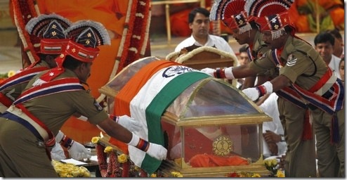 ביום רביעי נערכה הלוויתו של סאי באבא, בהשתתפות אנשי ממשל, לצד חצי מיליון מאמינים. ראשית נורה מטח יריות מ-21 רובים, על פי כללי הטקס של הדת האזרחית ההודית. אחר כך בא תורן של הדתות הישנות יותר, ומול ארונו מולמלו פסוקים מכתבי הקודש של הנצרות, האיסלאם, הסיקיזם, הבודהיזם והיהדות (אני מת לדעת מי הרב שעשה את זה). לאחר מכן ברהמינים זימרו פסוקים מהודות, מים מנהרותיה הקדושים של הודו הותזו על הארון, ולקינוח נשפך עליו גם שתן פרה. באבא עצמו נקבר ולא נשרף, בהתאם לנוהג לגבי קדושים בהינדואיזם. כל זה רק אחרי ביקורו של ראש הממשלה כמובן.