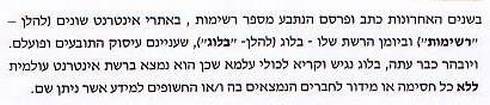 ועם כל זאת, ברור לכל בר דעת שיש כאן צומת מסויים בדברי ימי הבלוג שלי, אולי גם של אחרים. כאמור, כבלוגר אין לי את הגב הכלכלי שיש לעיתונאי, ולא את ההגנה המשפטית שמספק עיתון, על יועציו ועו"דיניו. אני לבד. זה הופך אותי להרבה יותר פגיע כמובן, ומן ההגיון שאזהר הרבה יותר. השאלה היא בעצם מה מידת הזהירות שעלי להפגין. על הדברים שכתבתי על טובלי אני בטוח שאוכל להגן בבית משפט. הם אמת והם מהווים עניין לציבור. ידעתי מה אני כותב ונזהרתי. לכן, גם אם אזהר בעתיד, ואזהר, אני רוצה להמשיך להיות מסוגל לפרסם דברים שכאלה, מתוך תחושה שטובת הציבור מחייבת לתת להם פרסום. כדי לעשות זאת אני צריך איזשהו גב.